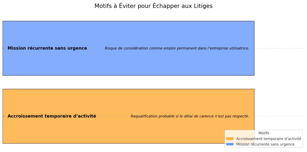 | Accroissement temporaire d’activité | Requalification probable si le délai de carence n’est pas respecté. |