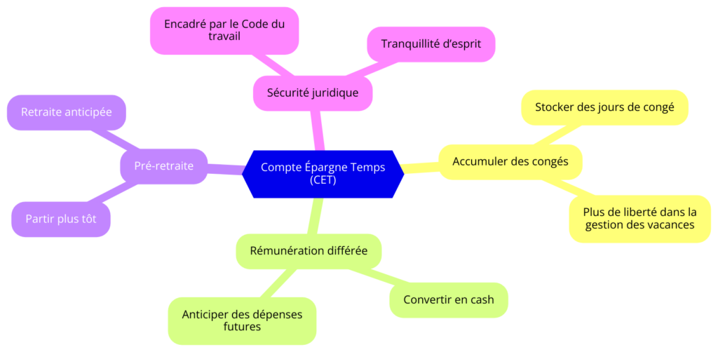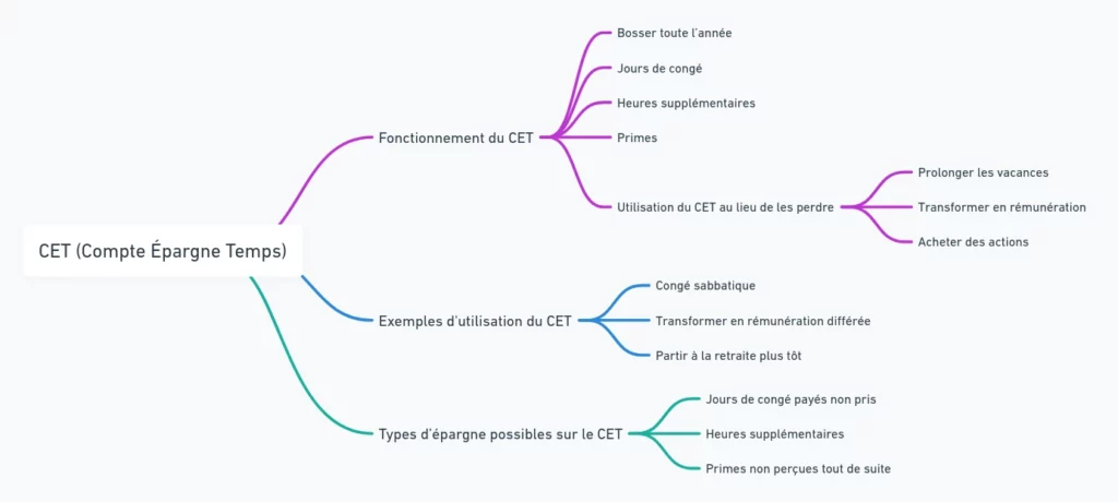 C’est simple ! Tu bosses toute l’année, t’as des jours de congé, des heures sup’, peut-être même des primes. Si t’utilises pas tout, au lieu de les perdre, tu peux les mettre sur ton CET. Et ensuite, tu décides : soit tu les utilises plus tard pour des vacances prolongées, soit tu les transformes en rémunération. T’as même la possibilité de te payer des actions, histoire de faire gonfler un peu ton capital.