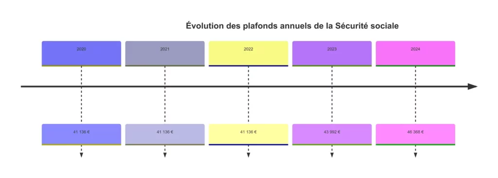 Comme on peut le voir, le plafond a stagné pendant deux années consécutives avant de connaître une hausse notable en 2023 et 2024. Cette augmentation est souvent le reflet de l’inflation et des ajustements économiques nécessaires pour s’assurer que le système de protection sociale reste viable.