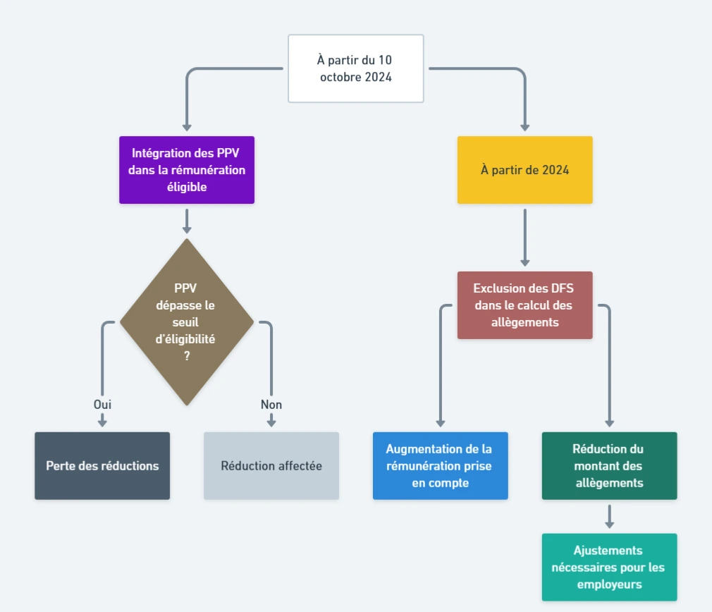 Dès le 10 octobre 2024, les primes de partage de la valeur (PPV) seront intégrées dans le calcul de la rémunération éligible aux allègements. Cela veut dire que si un employeur verse une PPV qui fait dépasser le seuil d’éligibilité, l’entreprise risque de perdre le bénéfice des réductions. Même si le salaire reste sous le plafond, le montant de la réduction pourrait être affecté par cette prime.