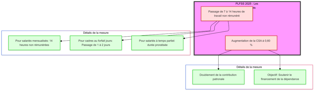 - Renforcement des ressources : en doublant les heures travaillées et le taux de la CSA, le gouvernement espère dégager des fonds supplémentaires pour la branche autonomie.