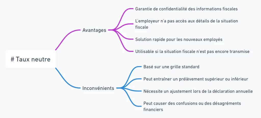 • Le taux neutre : Ce taux s’applique par défaut lorsque le contribuable n’a pas de taux personnalisé ou choisit de ne pas divulguer son taux à son employeur.