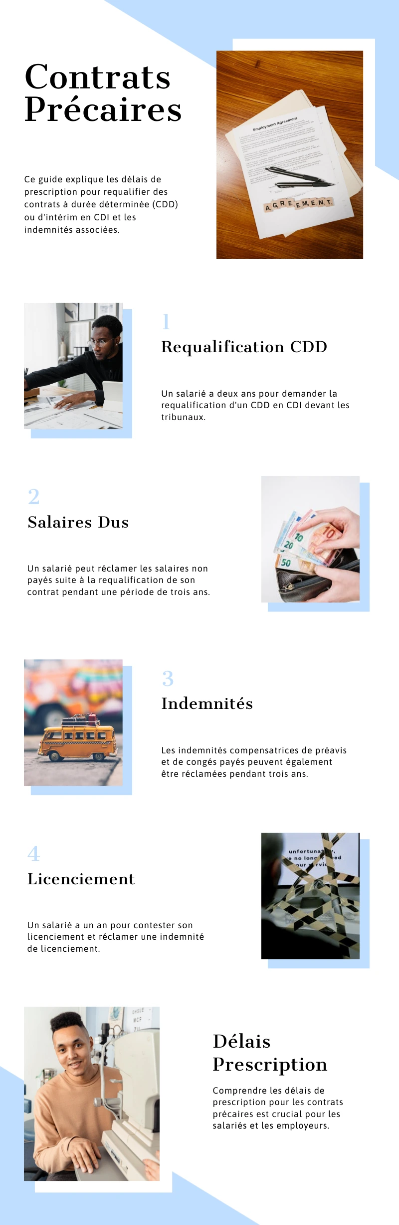 Ainsi, si un salarié estime que son CDD ou son contrat d’intérim a été abusivement renouvelé et qu’il aurait dû bénéficier d’un CDI, il dispose de deux ans pour engager une action en justice afin de faire reconnaître ses droits. Toutefois, s’il obtient gain de cause et que la requalification est reconnue, il peut ensuite réclamer les salaires dus sur une période de trois ans, tout comme les indemnités compensatrices de congés payés et de préavis. En revanche, s’il souhaite contester son licenciement et réclamer une indemnité de licenciement, il doit le faire dans un délai d’un an.
