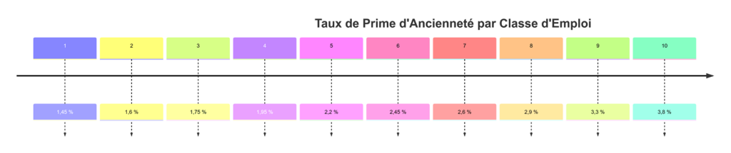 Voici un aperçu de la structure de la prime d’ancienneté. Chaque classe d’emploi est associée à un taux qui influence directement le montant final perçu par le salarié. Par exemple, un employé de classe 1 aura une prime moindre qu’un employé de classe 10, ce qui est logique étant donné les responsabilités et les exigences de chaque poste.