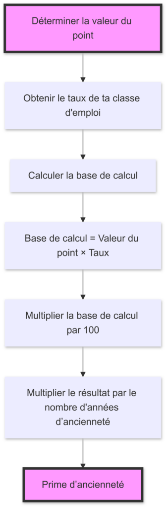 Prime d’ancienneté = (base de calcul spécifique × 100) × nombre d’années d’ancienneté