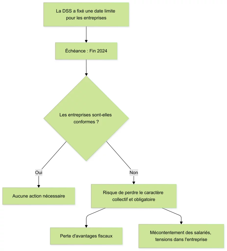 La DSS (Direction de la Sécurité Sociale) a donné un délai de tolérance pour permettre aux entreprises de se conformer aux nouvelles règles définies par le BOSS. Ce délai arrive à son terme à la fin de l’année 2024. Après cette date, si vos régimes de protection sociale ne sont pas en conformité, ils risquent de perdre leur caractère collectif et obligatoire.
