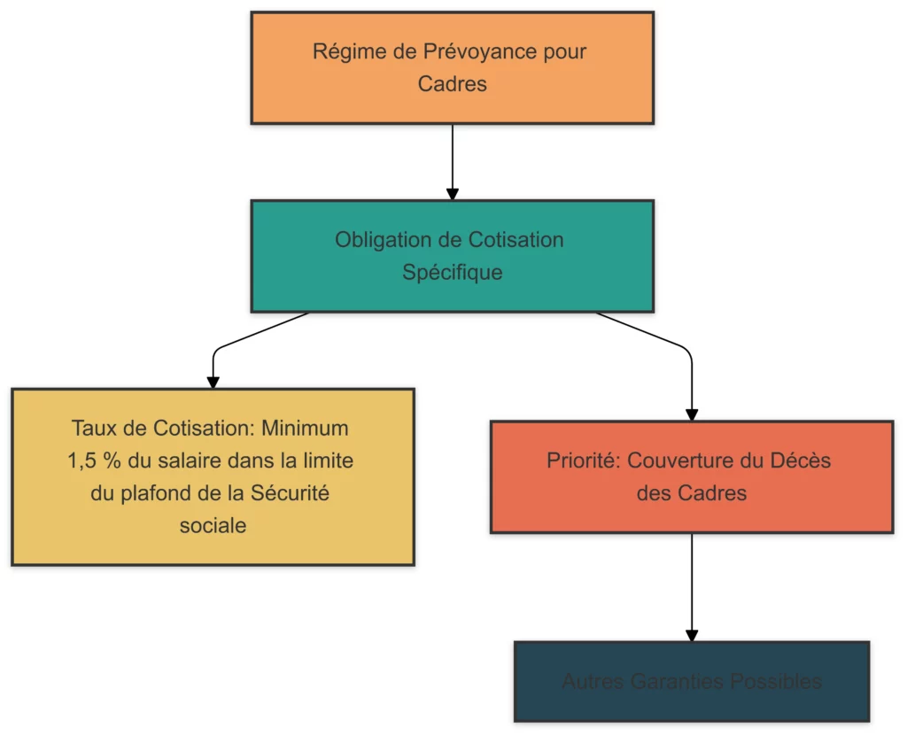- Priorité au décès : cette cotisation est en priorité affectée à la couverture du décès des cadres, bien que d’autres garanties puissent également être incluses.