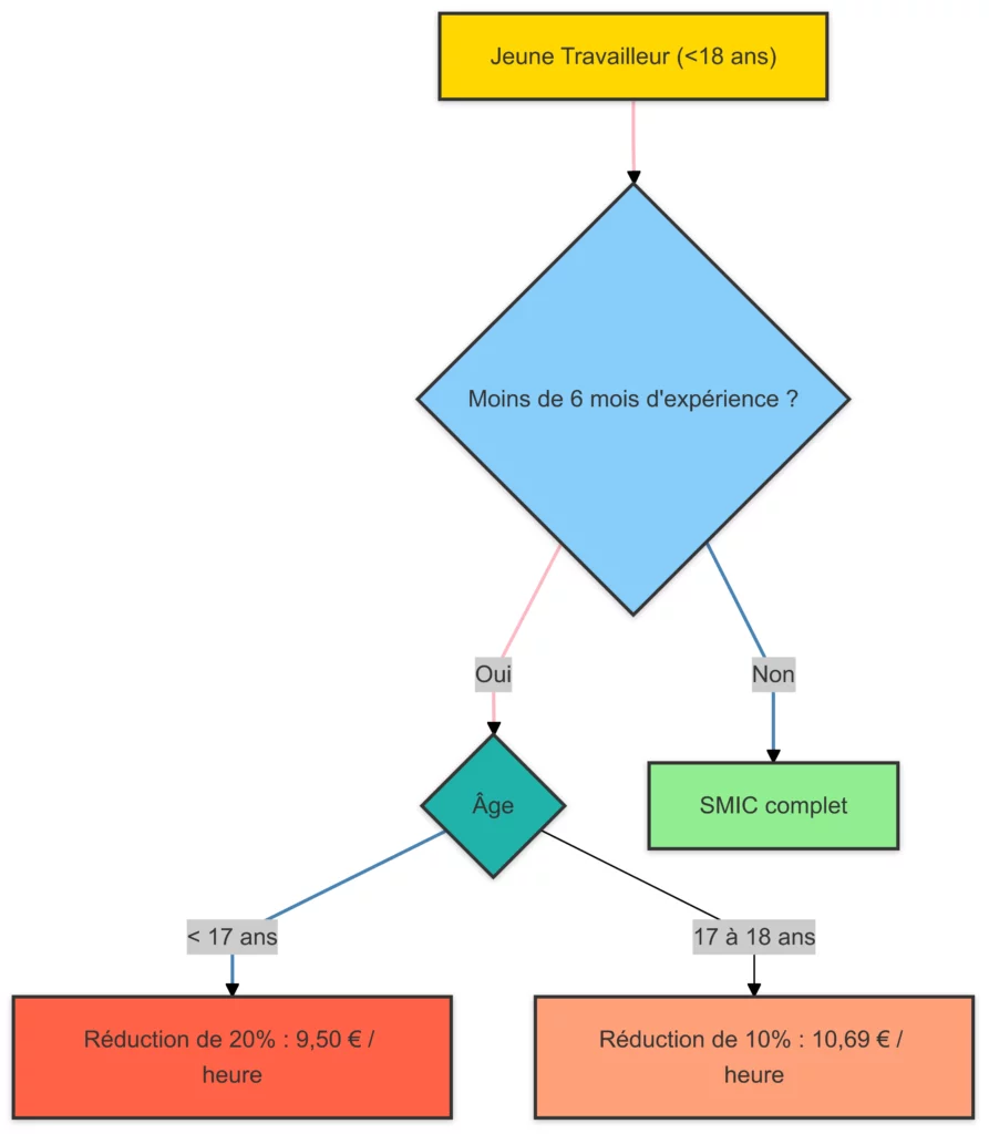 Si tu es jeune, de moins de 18 ans par exemple, tu n’es pas tout à fait au même taux que les adultes. Le Code du travail prévoit en effet des abattements pour les jeunes travailleurs, en fonction de l’âge et de l’expérience. Voici comment ça se passe :