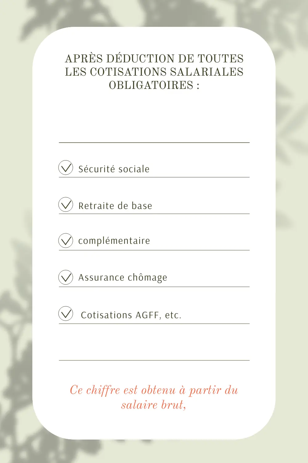 Ce chiffre est obtenu à partir du salaire brut, après déduction de toutes les cotisations salariales obligatoires :