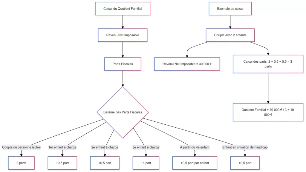 Pour calculer ton quotient familial, tu dois diviser le revenu net imposable de ton foyer par le nombre de parts fiscales. Voici le barème :