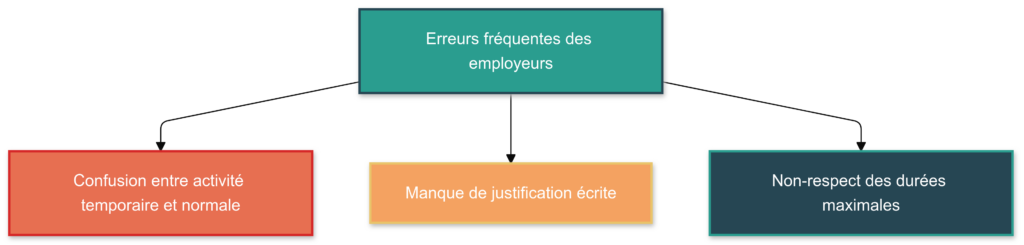 | Activité permanente | Interdit d’utiliser CDD ou intérim pour une activité normale. | Sanctions financières, litiges aux prud’hommes. |