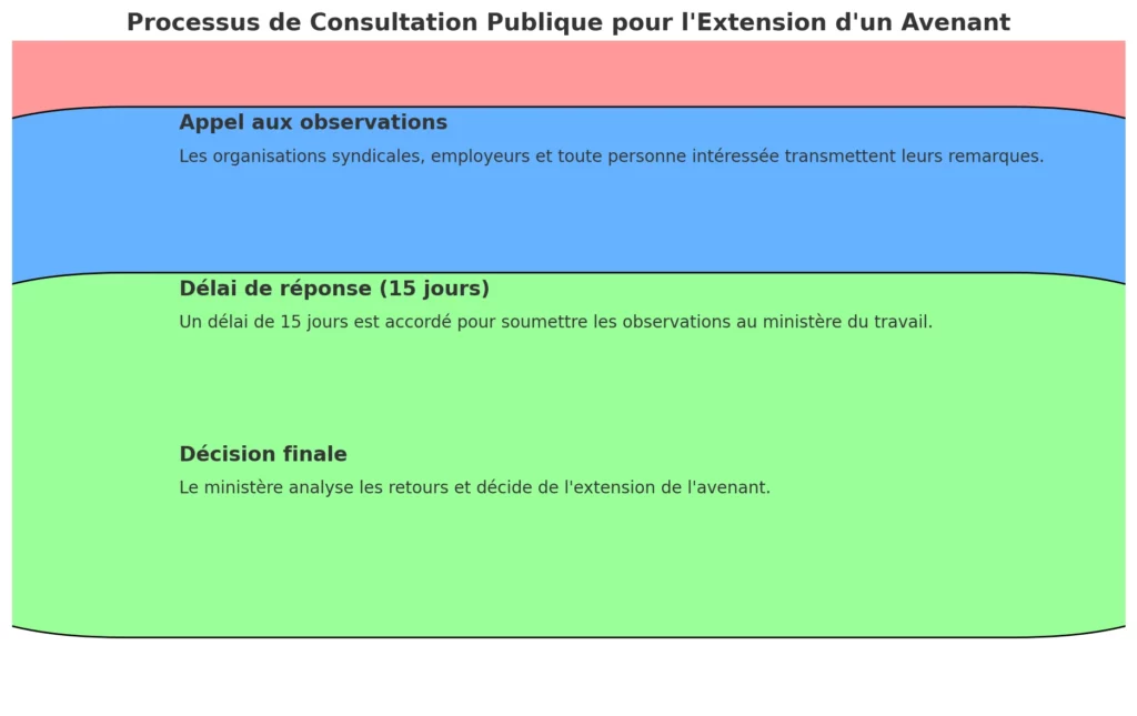 Avant qu’un avenant ne soit étendu, il passe par une phase de consultation publique. Cette étape est cruciale pour s’assurer que toutes les parties prenantes ont la possibilité de s’exprimer.