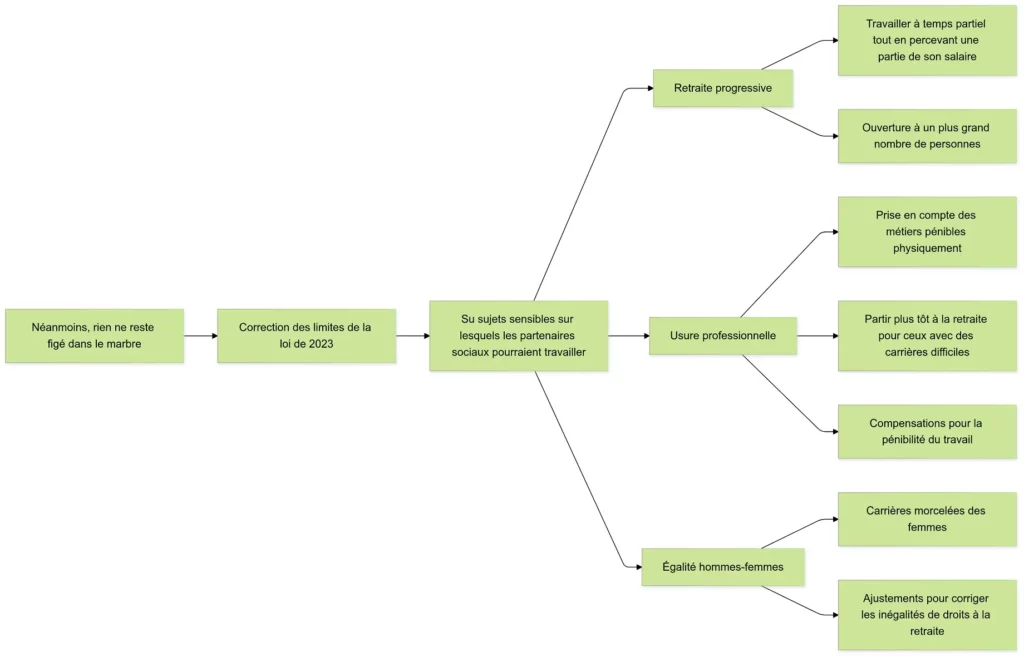 Néanmoins, rien ne reste figé dans le marbre. On peut encore ajuster certaines limites de la loi votée en 2023. Parmi les sujets sensibles sur lesquels les partenaires sociaux pourraient travailler, on peut citer :