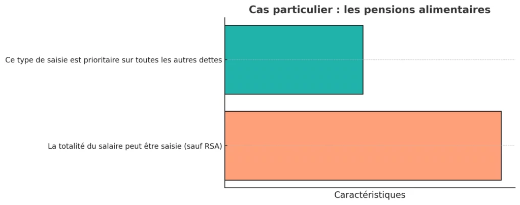 | Cas spécifiques | Pension alimentaire : totalité saisissable sauf RSA |