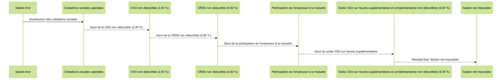 Le calcul du salaire net imposable se fait à partir du salaire brut, auquel on soustrait certaines cotisations et on ajoute d’autres éléments non déductibles :