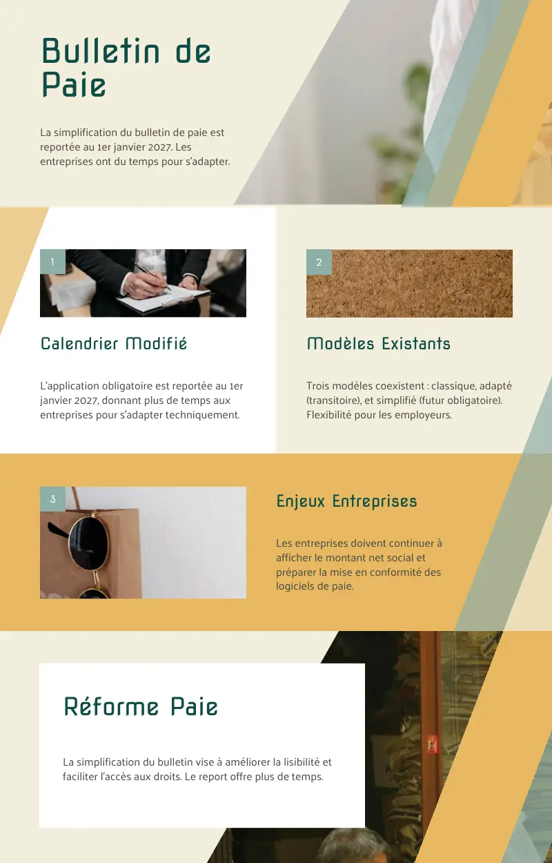 - 1er janvier 2025 : initialement prévue comme la date d’application obligatoire du nouveau modèle de bulletin de paie simplifié.