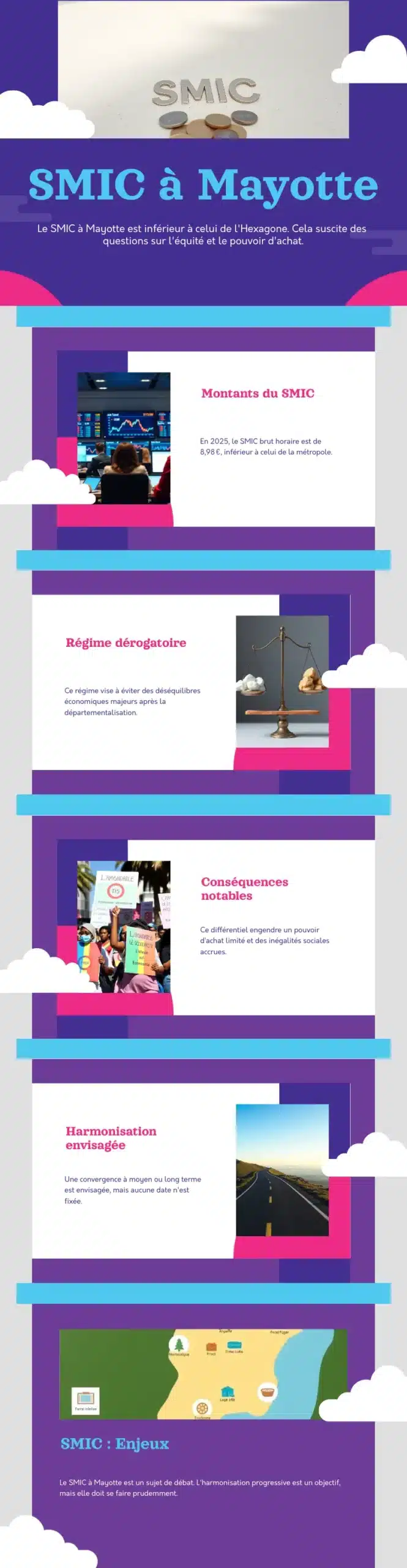 Le SMIC à Mayotte est plus bas que celui en vigueur dans le reste de la France en raison d’un régime transitoire dérogatoire mis en place après la départementalisation de Mayotte en 2011. Ce régime a été conçu pour éviter des déséquilibres économiques majeurs dans un territoire marqué par :