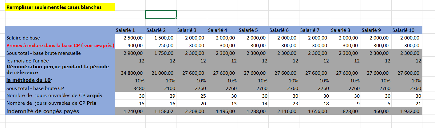 Calcul de l’indemnité et la provision de l’indemnité de congés payés Excel avec formule