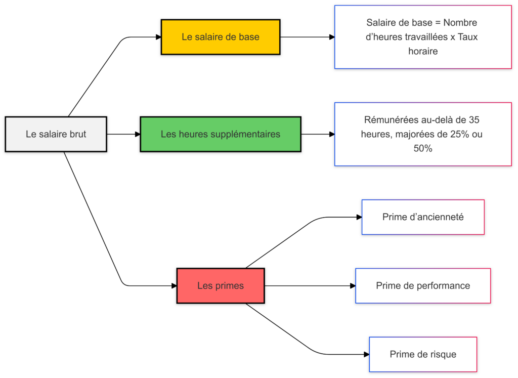 Le salaire brut représente le montant total payé avant toute déduction. Il comprend plusieurs composants :