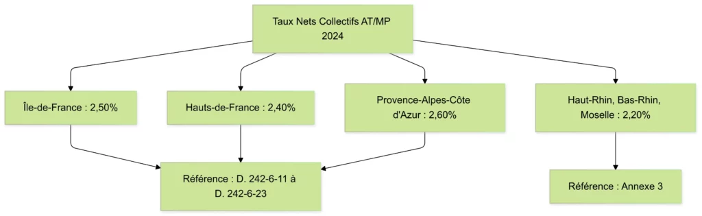 Les départements de l’Alsace-Moselle bénéficient d’une tarification particulière. Les taux nets collectifs pour ces régions (Haut-Rhin, Bas-Rhin, Moselle) sont spécifiques et diffèrent du reste de la France. Ils sont détaillés dans l’annexe 3. Cette particularité est liée au régime spécifique dont bénéficient ces départements, héritage de leur histoire sociale.