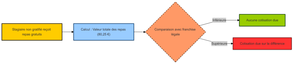 Certains stagiaires (notamment ceux en stage de moins de 2 mois) peuvent bénéficier d’avantages repas sans gratification. Dans ce cas, la valeur des avantages est soumise aux règles générales d’assujettissement aux cotisations, sauf si elle reste en dessous de la franchise légale.