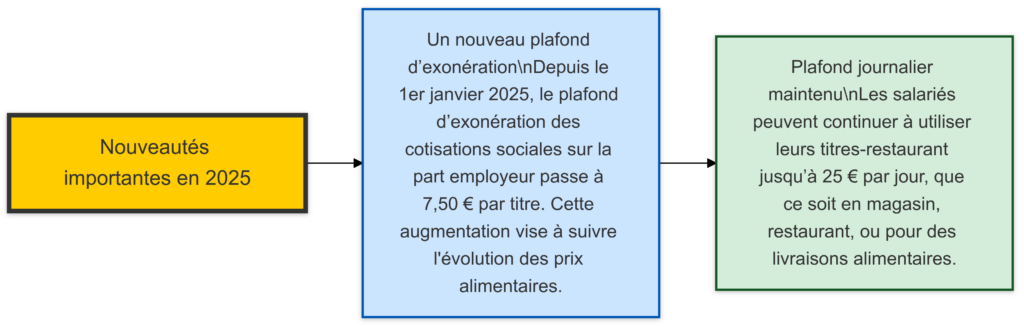 Depuis le 1er janvier 2025, le plafond d’exonération des cotisations sociales sur la part employeur passe à 7,50 € par titre. Cette augmentation vise à suivre l’évolution des prix alimentaires.