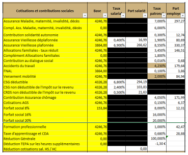 - Cotisations patronales : celles que l’employeur verse en plus du salaire brut.