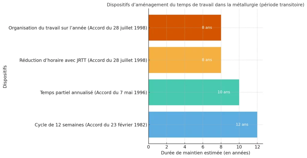 Plusieurs accords nationaux antérieurs ont défini des mécanismes pour aménager le temps de travail des salariés dans la métallurgie. Ces mécanismes, même s’ils ne correspondent plus totalement aux nouvelles normes, peuvent continuer à s’appliquer pendant la période transitoire.