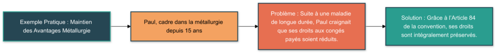 Prenons le cas de Paul, un cadre dans la métallurgie depuis 15 ans. Suite à une maladie de longue durée, Paul craignait que ses droits aux congés payés soient réduits. Grâce à l’Article 84 de la convention, ses droits sont intégralement préservés.