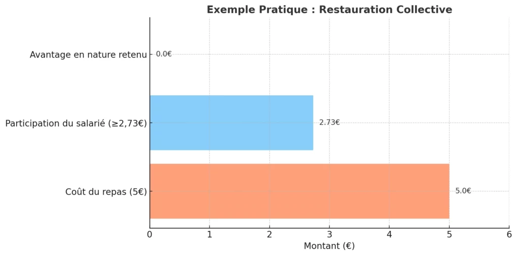Si un repas en cantine coûte 5 €, et que le salarié paye au moins 2,73 €, aucun avantage en nature nourriture ne sera retenu pour les cotisations sociales.